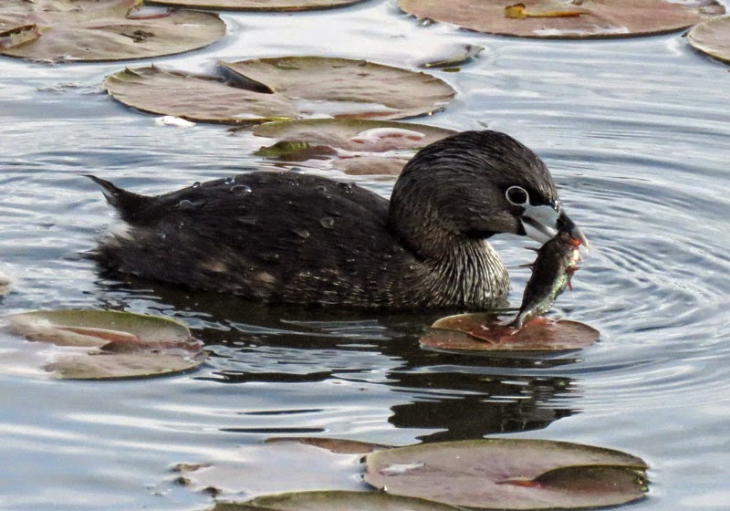 And here we have a Pied-billed Grebe that has already located its dinner, a small fish called a sculpin: