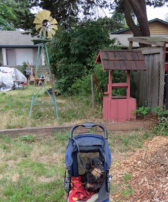 When people see Truman in his stroller, they sometimes assume he's an elderly dog, or a lame dog, and are surprised when I say he is only four years old and perfectly healthy. Then I explain that what he has is a psychological condition -- he only likes to walk towards his home or towards the car, and refuses to walk away from them. So he has his own personal limo and his own personal well-trained chauffeur to pop him into his stroller to take him on the outward journey, and when we turn around, he gets out and runs back to the house or car, pulling the well-trained chauffeur all the way.